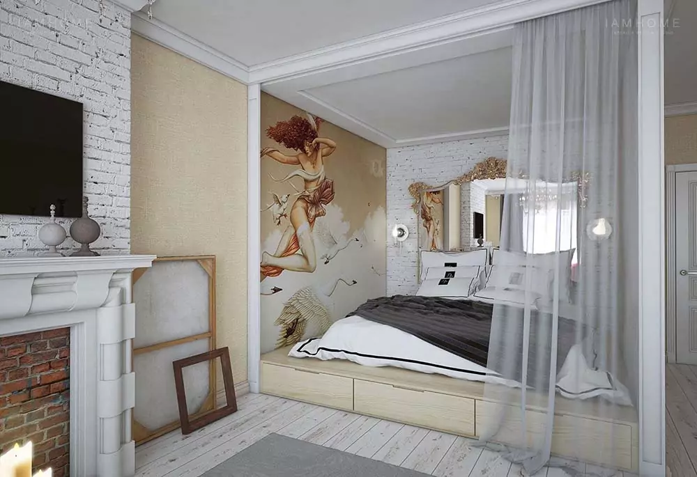 Если ниша достаточно большая, чтобы в ней разместилась кровать, то можно повесить круглое зеркало или оформить панно из нескольких небольших зеркал.