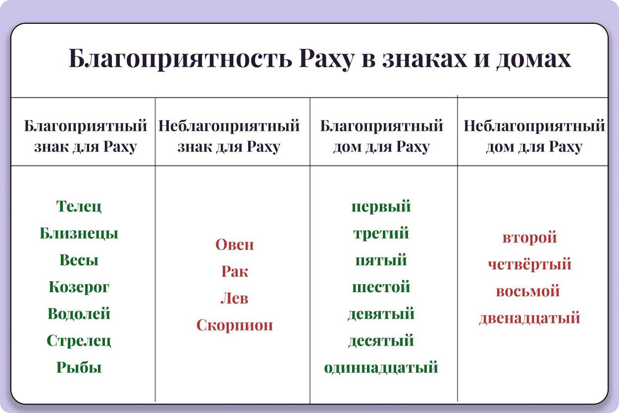 Чтобы понять, насколько Раху благоприятен в вашей карте, важно в первую очередь рассмотреть его положение в знаке и в доме.