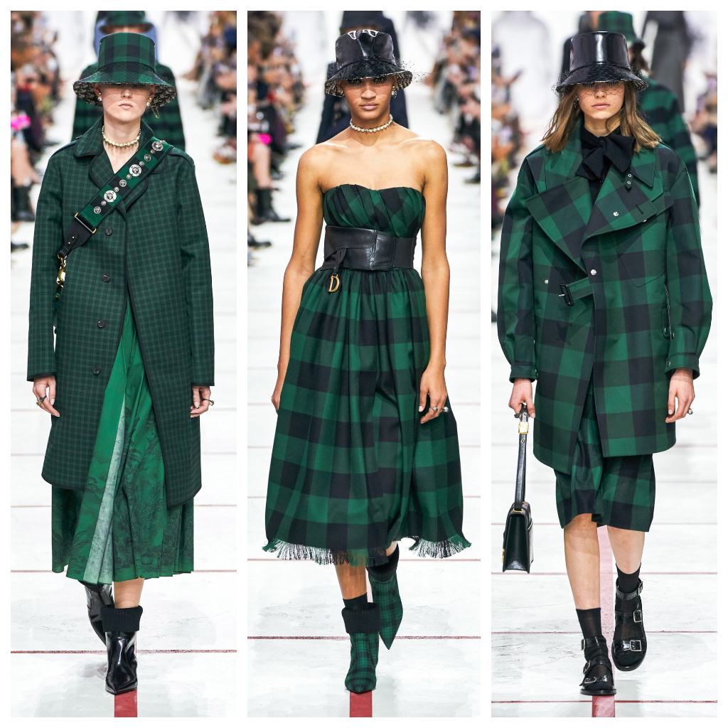 Еще одна модная тенденция — использование зеленого в сочетании с клетчатым принтом. С одной стороны, клетка приглушает насыщенный зеленый, делая его более спокойным. С другой — зеленый цвет в сочетании с темной клеткой становится более сочным. В осенне-зимней коллекции Dior зеленый клетчатый принт стал настоящим хитом.