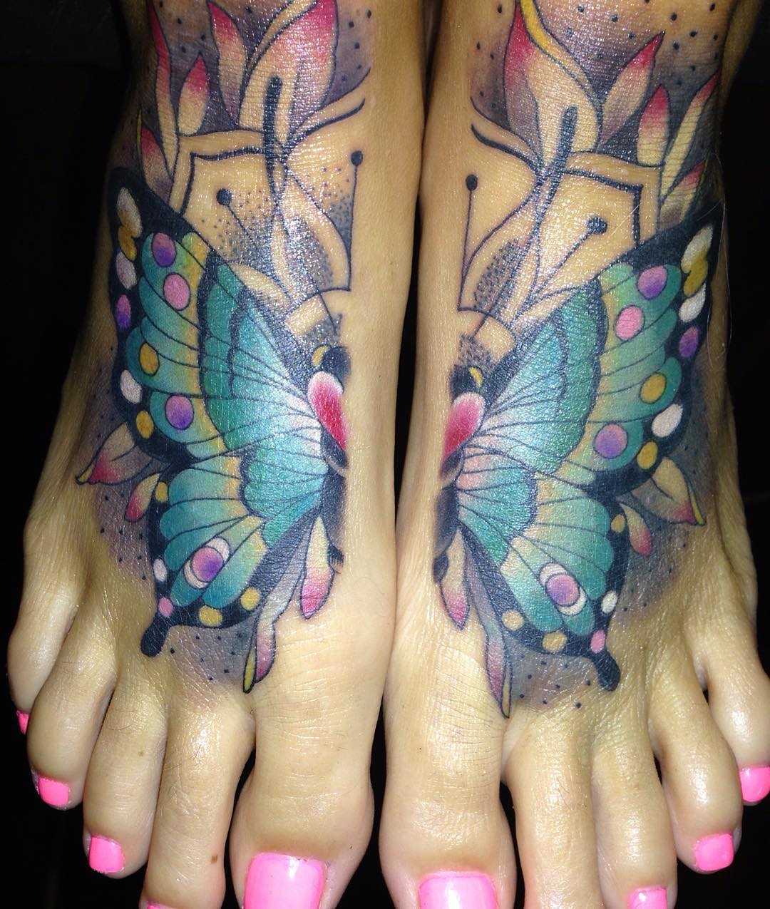 Пример яркой цветной тату с двумя бабочками разного цвета для девушки