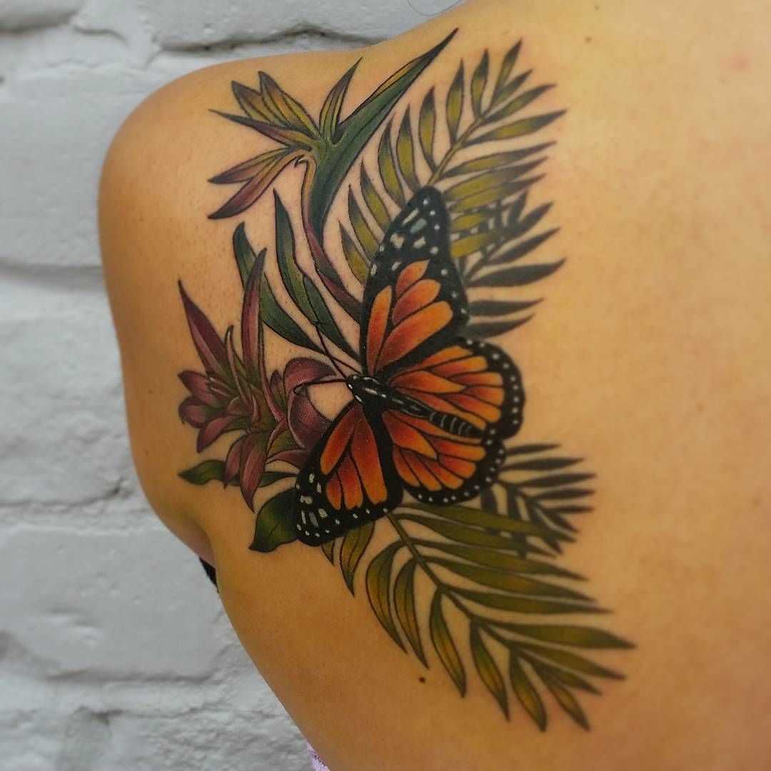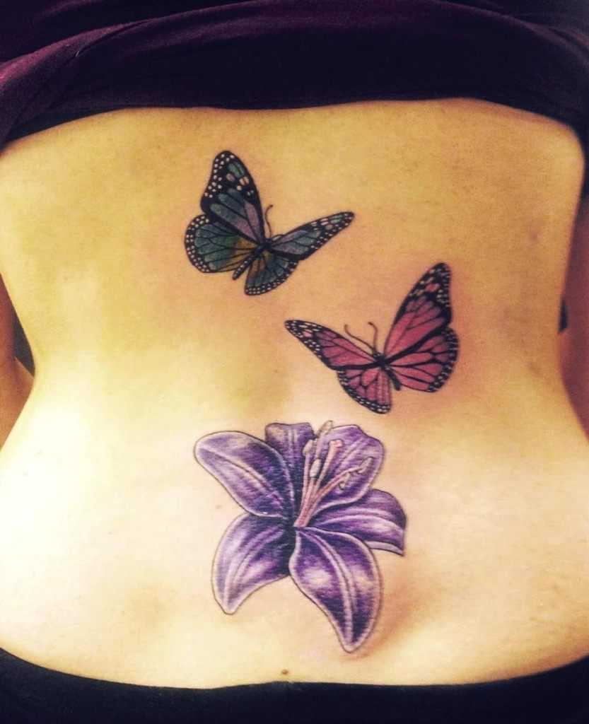 Для тех, кто ищет более сложны дизайны татуировок, добавление цветов может стать отличным вариантом для вас. Сочетание красочной бабочки с яркими цветами приводит к яркому дизайну, который лучше всего смотреться на большой площади.