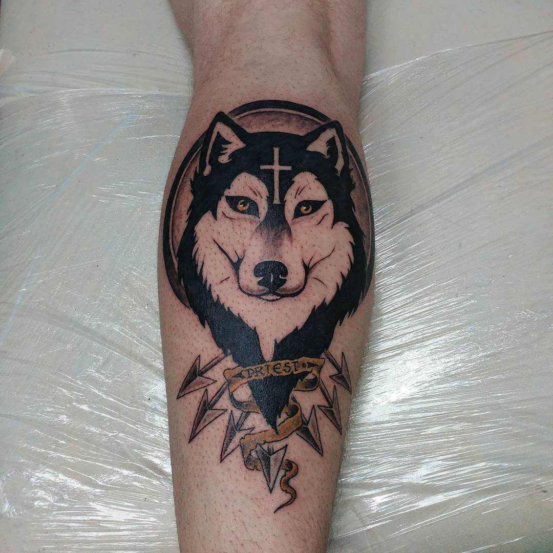 - На ноге. Если девушки обычно «набивают» рисунок на бедре, то мужчины предпочитают делать это на икре или голени. В таких случаях изображение пса означает силу, стремление к власти, победу, лидерство.