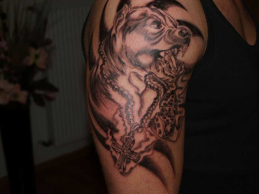 Рекомендуем посмотреть тату питбуль фото – среди множества вариантов довольно часто встречается изображение на руке. К примеру, на плече или на бицепсе. Мышечный рельеф придаст собаке особый характер! Теперь подробнее о том, какое именно значение скрывается в этом изображении: