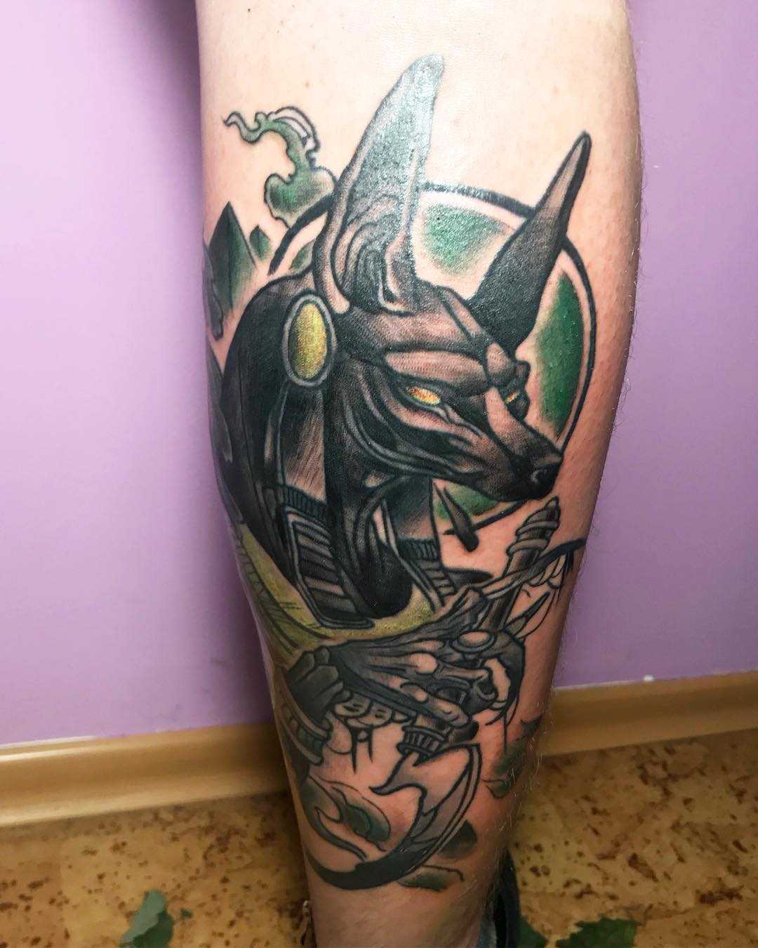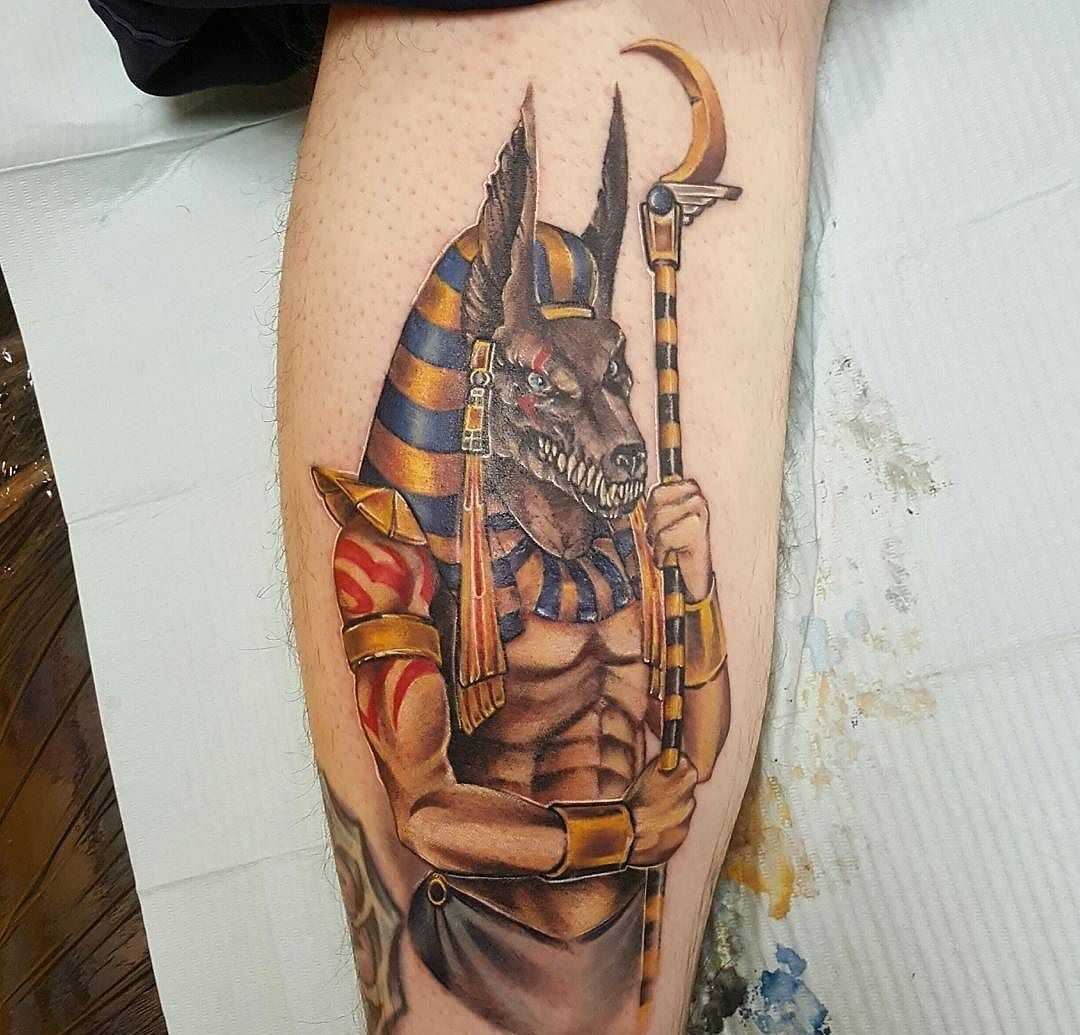 Тату Анубис на икре – оптимальный вариант при изображении бога в стиле реализм.