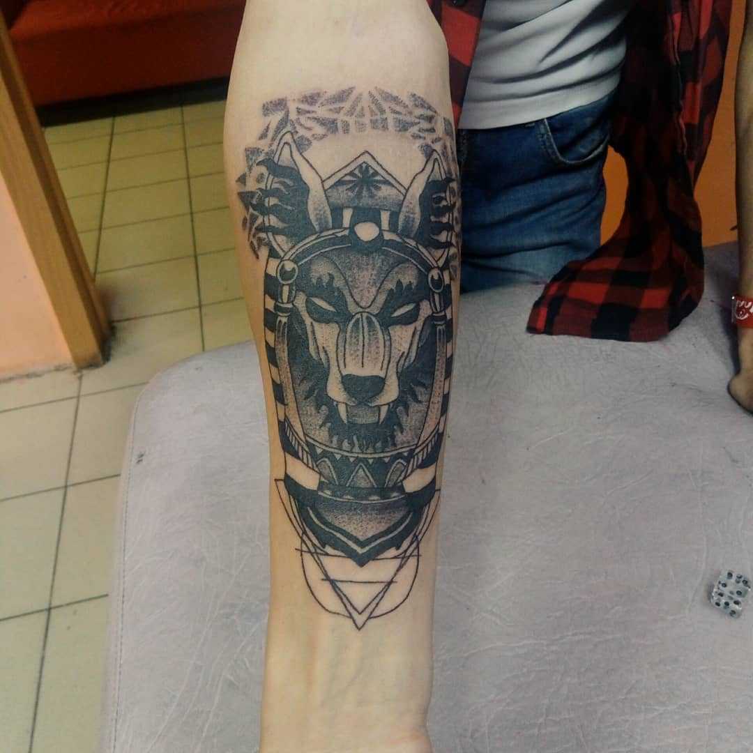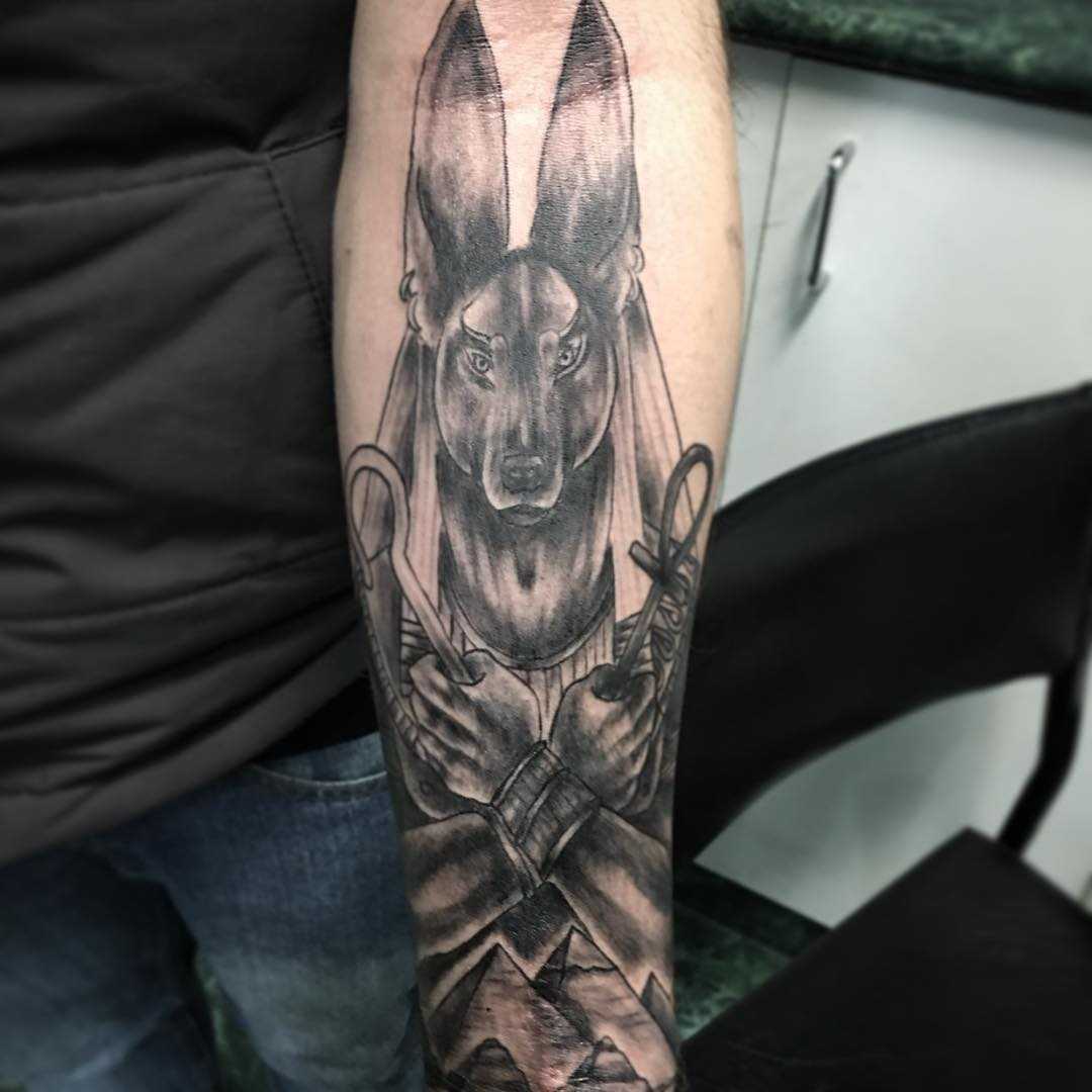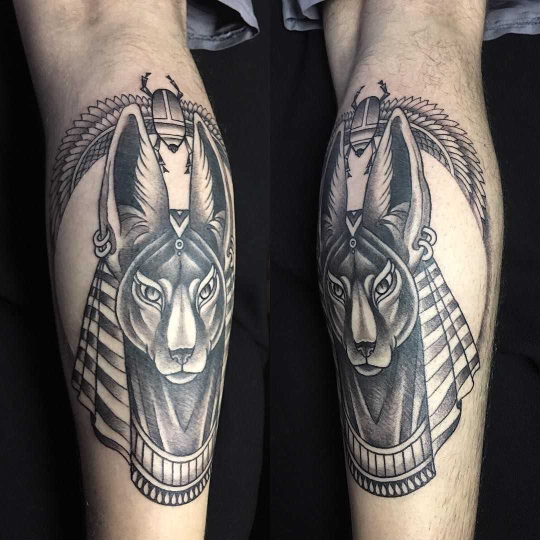 Тату анубис на предплечье. Эскизы также подходят для представителей обоих полов. В этой зоне получаются красивые наколки, так как изображение словно оживает, когда двигается рука. Часто набивают анубис и ра тату на предплечьях, лопатках, икрах, груди, голенях, размещая богов симметрично. Нередко используется стиль минимализм, без лишних деталей.