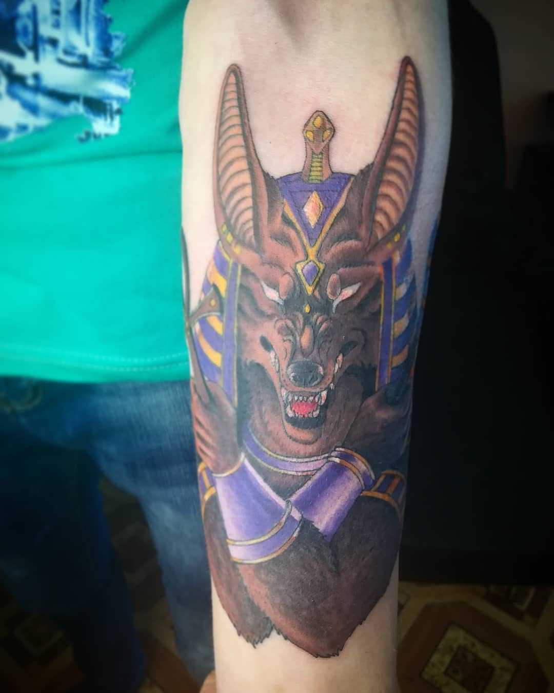 Тату Анубис на руке – классический вариант с изображением древнеегипетского бога.