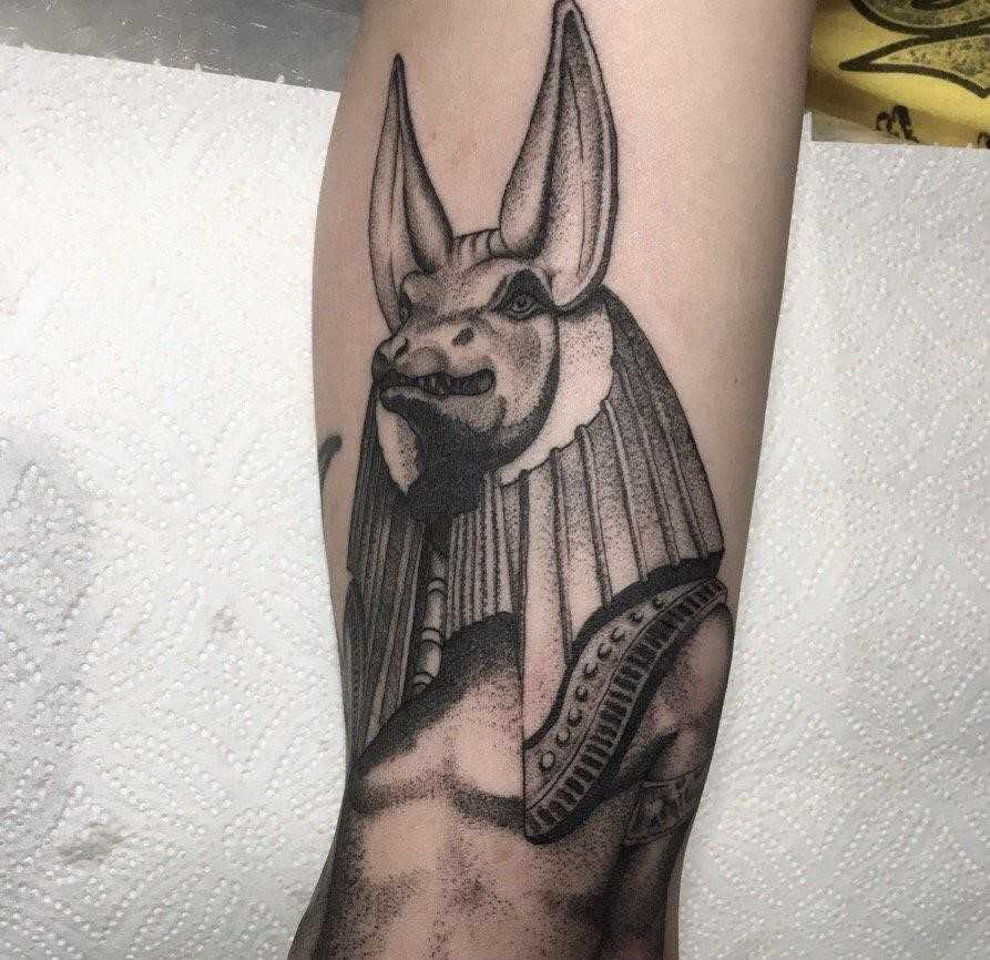 Тату Анубис на предплечье или плече – оптимальный вариант для сдержанного рисунка без лишних деталей и дополнений.