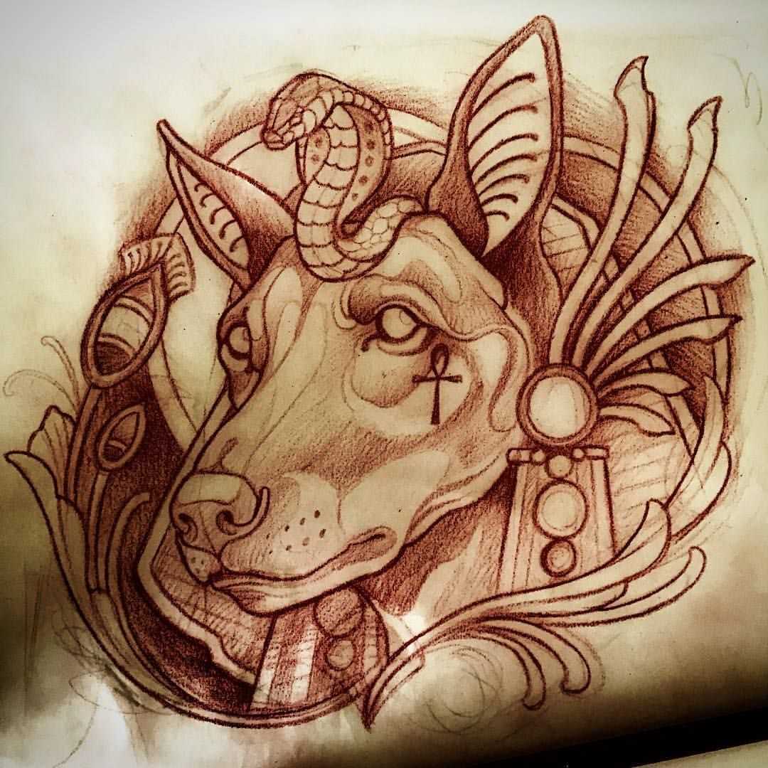 Анубис – бог, выступающий посредником для умерших, которым нужно попасть в иной мир. В тоже время он хранитель ядов и лекарств, поэтому в современном мире Анубис – это бог, открывающий путь, возможности которого безграничны. При выборе эскиза большинство выбирает классическое изображение, изображая бога в человеческом облике с головой шакала или собаки.