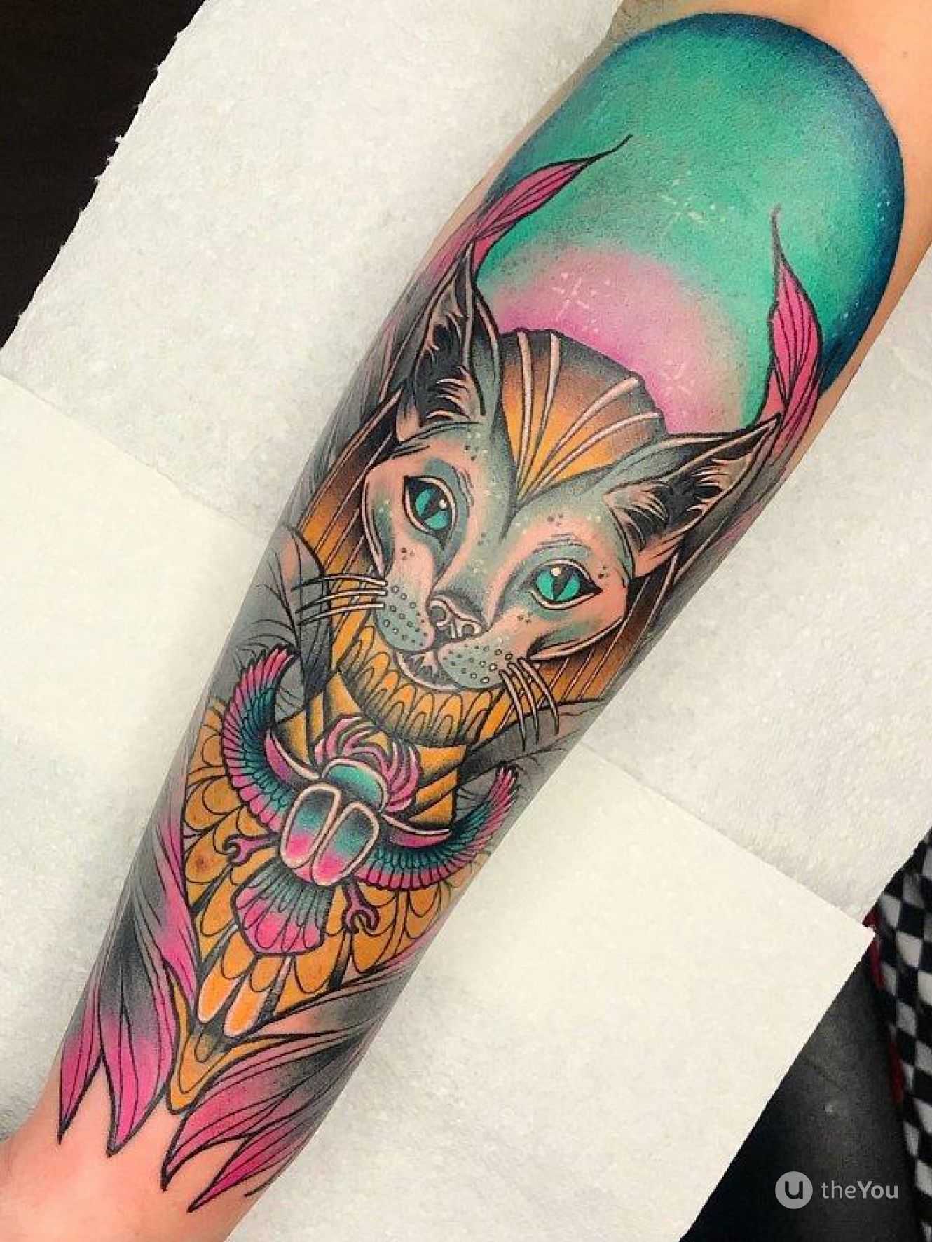 Очень быстро различные египетские символы обрели особую популярность. Среди символов встречаются глаза бога Ра, скарабеи, анкхи и многие другие мифические вещи. Многие тату-мастера считают, что эта тема уже не актуальна и морально устарела, но это не совсем так
